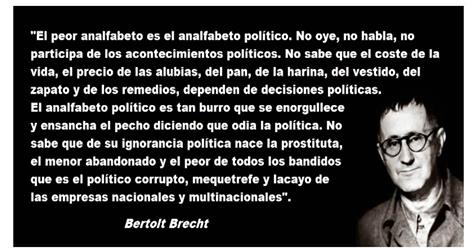 "El peor analfabeto es el analfabeto político. No oye, no habla, no participa de los acontecimientos políticos. No sabe que el coste de la vida, el precio de las alubias, del pan, de la harina, del vestido, del zapato y de los remedios dependen de decisiones políticas. El analfabeto político es tan burro que se enorgullece y ensancha el pecho diciendo que odia la política. No sabe que de su ignorancia política nace la prostituta, el menor abandonado y el peor de todos los bandidos que es el político corrupto, mequetrefe y lacayo de las empresas nacionales y multinacionales." Bertolt Bretch